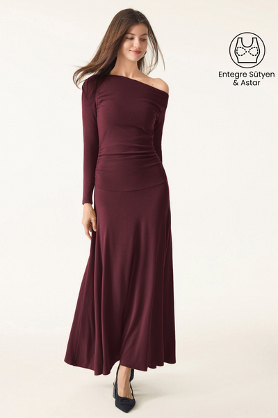 Asimetrik Maxi Elbise Çift Omuz ve Büzgülü