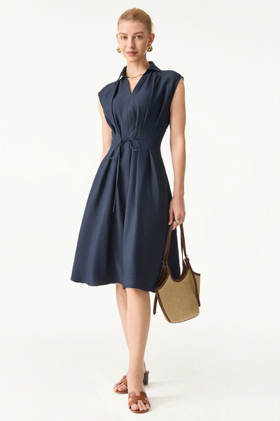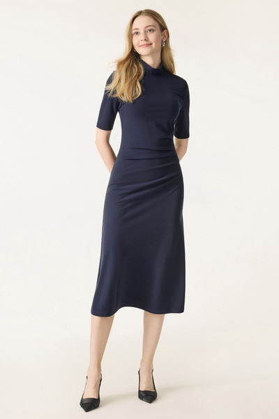 Tuck Detaylı Yarım Kollu Yüksek Yaka Elbise