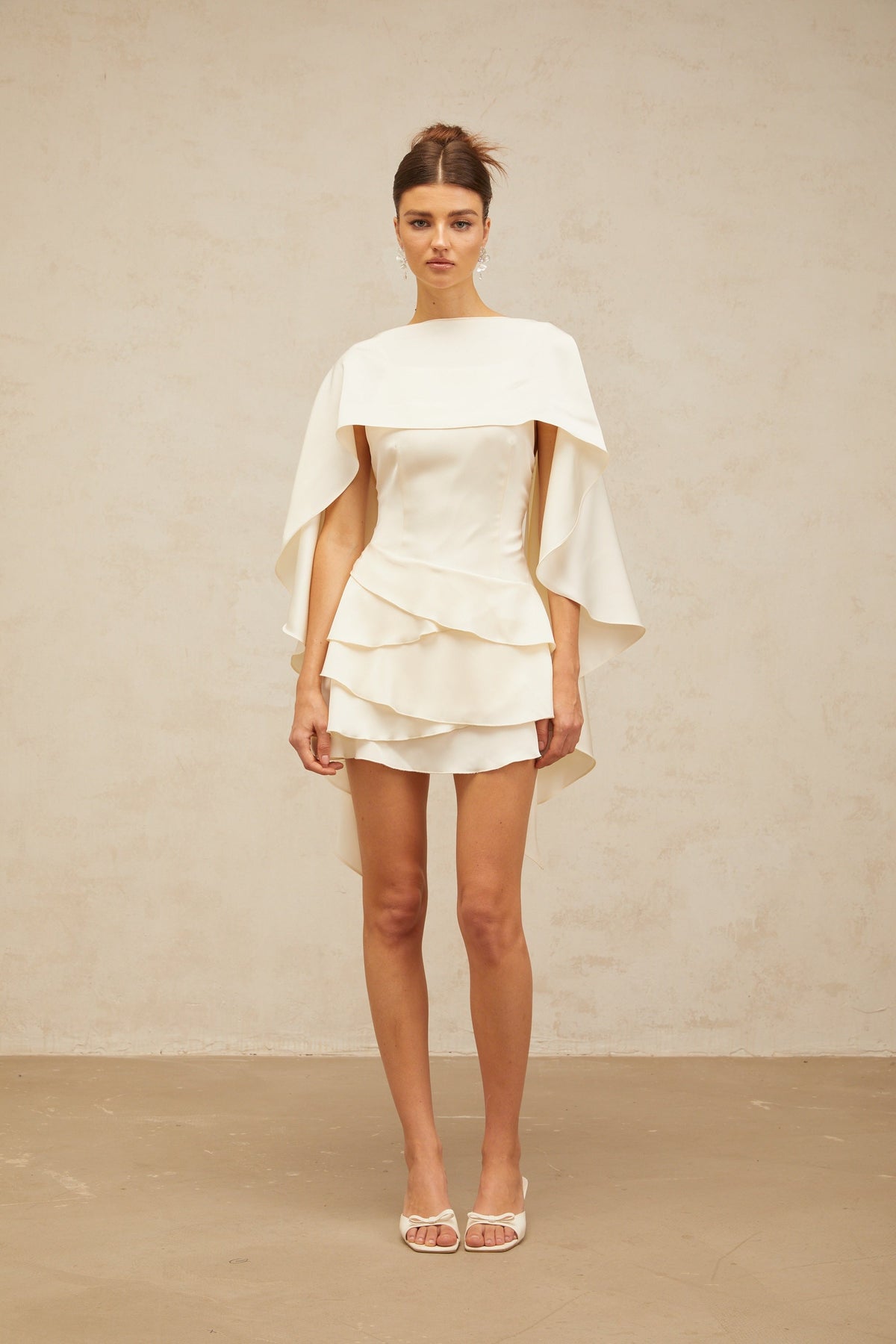 Lyna Beyaz Saten Fırfırlı Mini Elbise